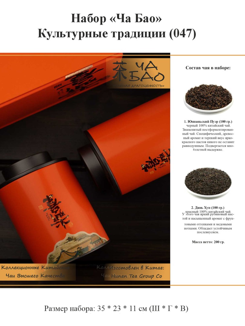 Артикул: 25858Чайный набор "Ча Бао" №4 - Культурные традиции (047), Китай, 200 гр. набор, «Культурные Традиции» - для сильных духом. В нём две «драгоценности» провинции Юньнань: красный чай Дянь Хун и чёрный Пуэр. Энергичность, стойкость, сила, прямота, ничего лишнего. Состоит из двух стограммовых жестяных баночек.