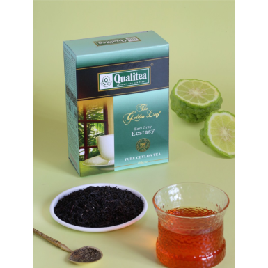 Чай "Кволити" Золотой лист с бергамотом. Масса нетто 100 грамм. Состав: 100% цейлонский среднелистовой черный чай стандарта FBOP, масло бергамота