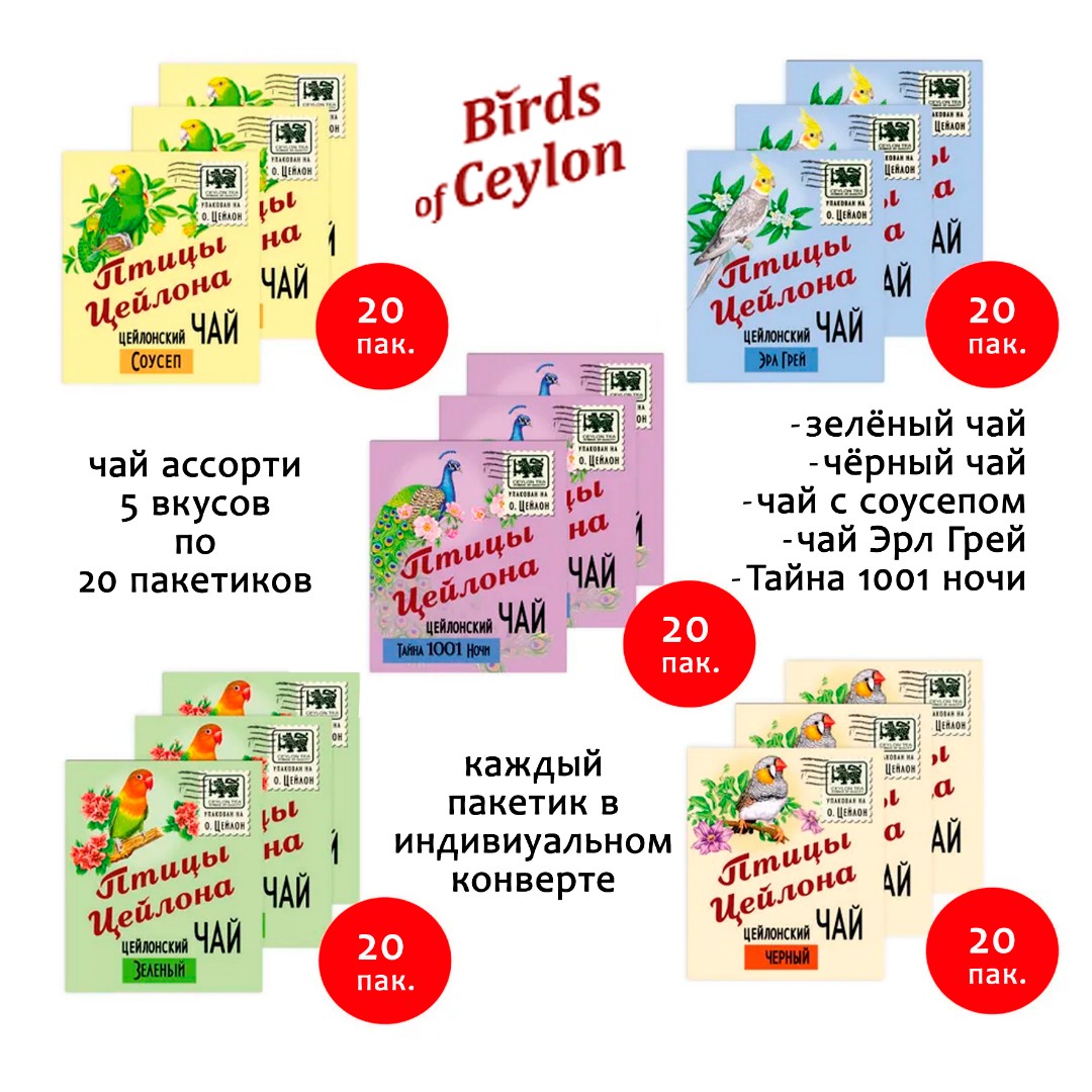 Чай цейлонский "Птицы Цейлона" - Ассорти, в индивидуальных конвертах, 5 вкусов по 20 пак. (100 пак.)