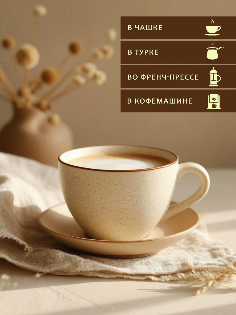 - Способ заваривания: можно приготовить в чашке, френч-прессе, гейзерной кофеварке