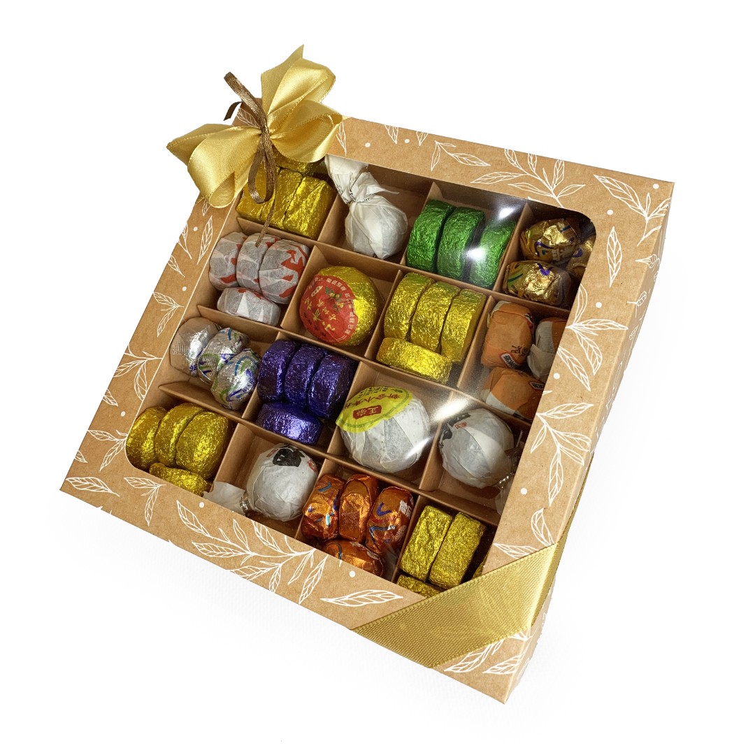 - Состав: Шу пуэр точа 035, Шу пуэр Истлэнд, Шу пуэр Юннаньский квадрат, Шу пуэр дикий в лайме, Шу пуэр с апельсиновыми корочками, Шу пуэр с хризантемой, Шу пуэр с Чен Пи (с мандариновыми корочками), Шу пуэр с цветами коричного дерева, Шу пуэр с лавандой, Шу пуэр с белым жасмином, Шу пуэр Юннаньский медальон, Шу пуэр Сяо Цин Ган, Шен пуэр Юннаньский медальон, Люй пуэр