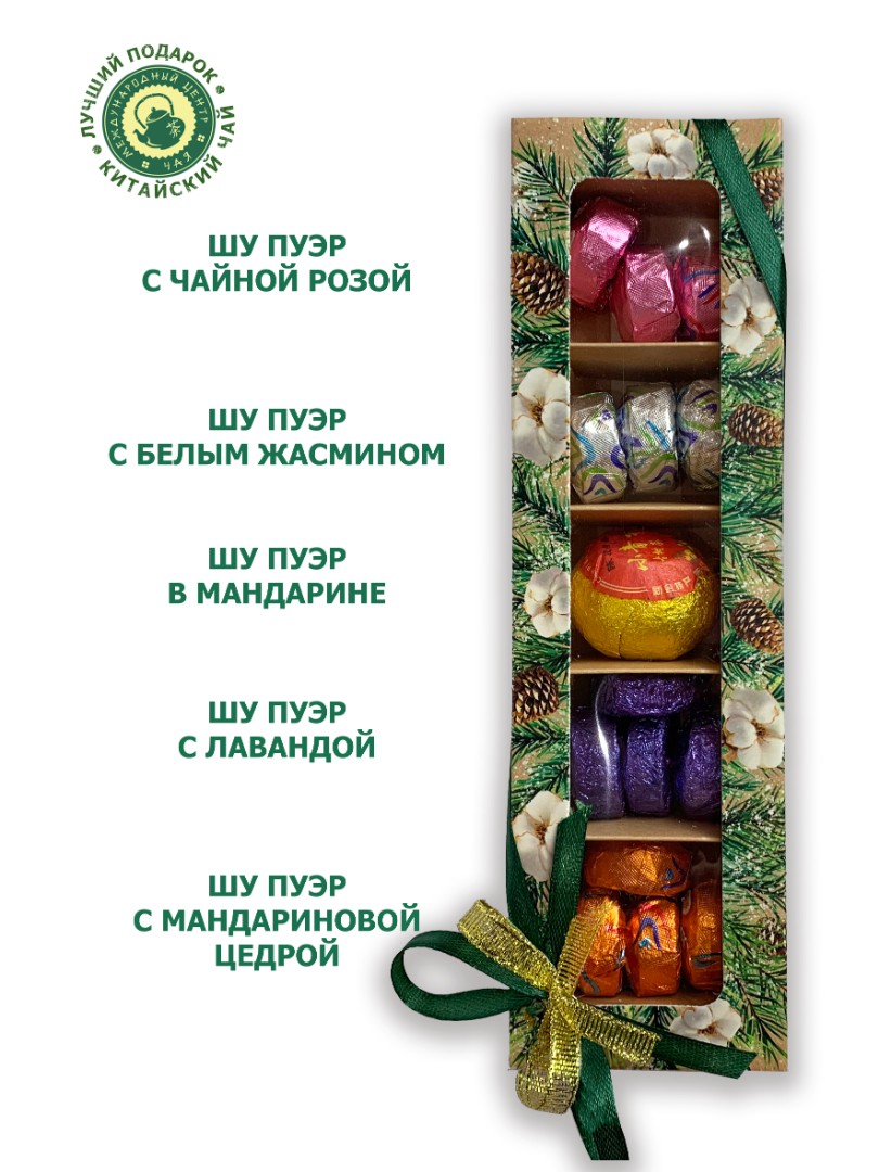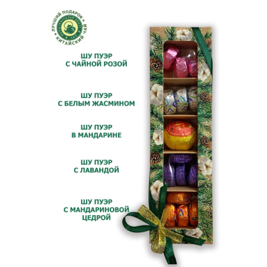 - Состав: 1 - Шу пуэр с мандариновой цедрой (чен пи) 2 - Шу пуэр с белым жасмином 3 - Шу пуэр с чайной розой 4 - Шу пуэр с лавандой 5 - Шу пуэр в мандарине "Сяо Цин Ган"