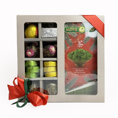 - Состав: 1 - Шу пуэр Юннаньский медальон 2 - Шу пуэр в мандарине "Сяо Цин Ган" 3 - Шен пуэр Юннаньский медальон 4 - Красный связаный чай "Рубиновая капля" 5 - Зелёный связаный чай " Цянь Ри Хун" 6 - Белый прессованный выдержанный чай "Юэ Гуанбай" 7 - Белый шоколад с зелёным чаем Матча