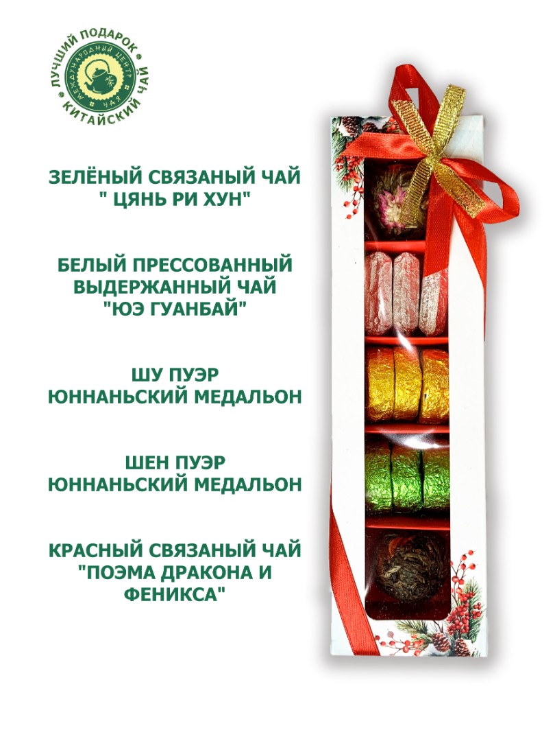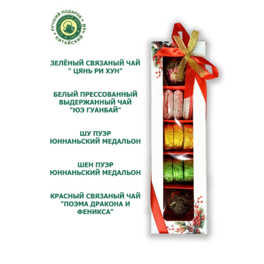 - Состав: 1 - Шу пуэр Юннаньский медальон 2 - Шен пуэр Юннаньский медальон 3 - Красный связаный чай "Поэма дракона и феникса" 4 - Зелёный связаный чай " Цянь Ри Хун" 5 - Белый прессованный выдержанный чай "Юэ Гуанбай"