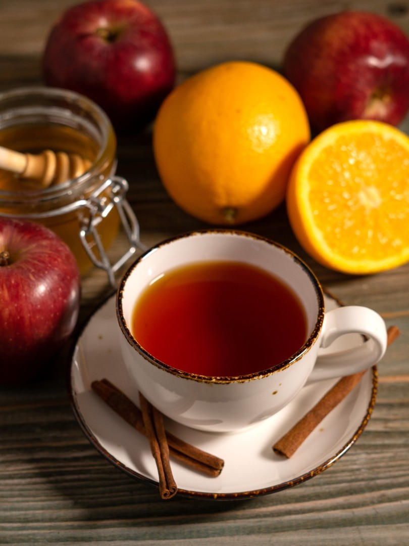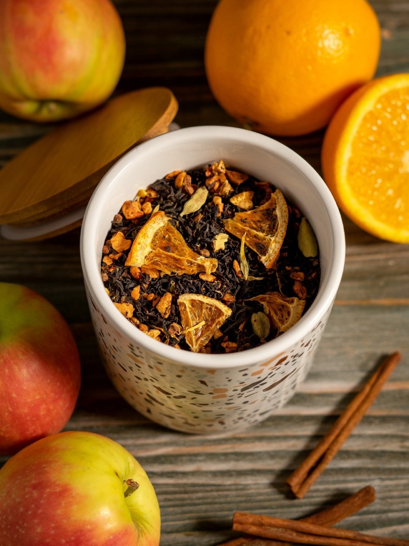 - Состав: 100% цейлонский черный крупнолистовой чай, яблоко, корица, кардамон, кусочки апельсина, календула, ароматизатор.
