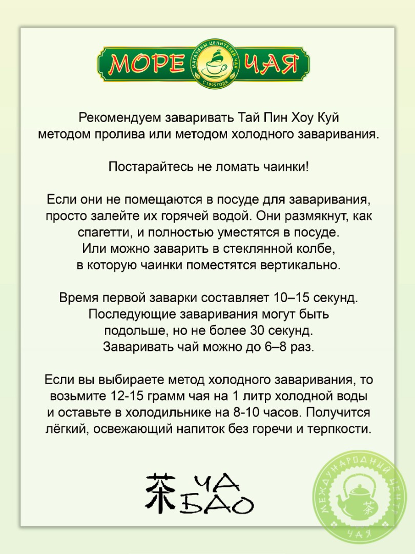 Тай Пин Хоу Куй — воплощение мастерства и традиций, передаваемых из поколения в поколение, и настоящее сокровище для ценителей высококачественного чая.