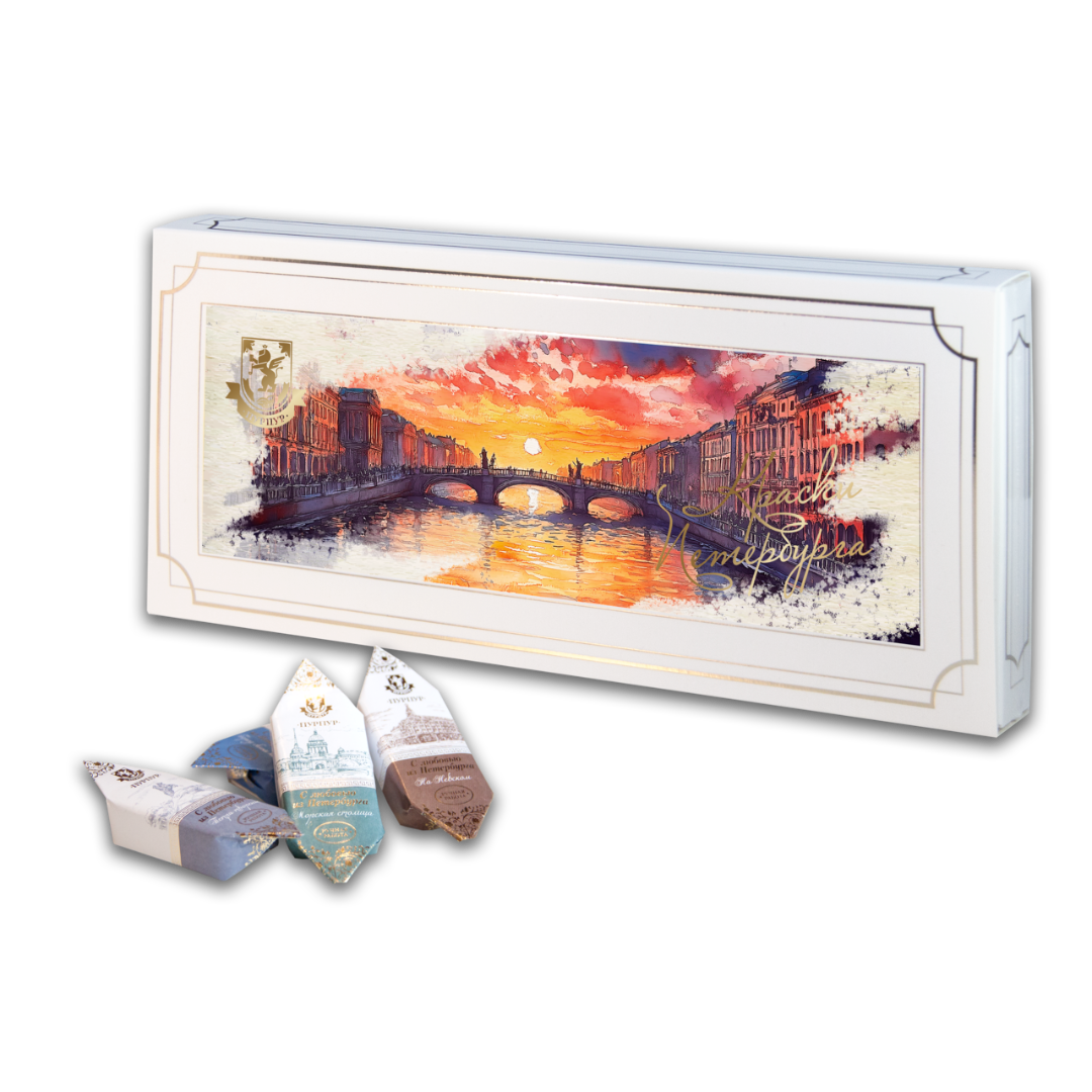 - Состав: Состав1) Петра Творенье - марципановая помадка в тёмном шоколаде Шоколад темный (какао тертое, сахар, какао-масло, эмульгатор (подсолнечный лецитин), ваниль натуральная), марципан (миндаль 20%, сахар, сироп глюкозно-фруктозный, молоко сухое цельное, ядро арахиса тертое, агент влагоудерживающий (глицерин), коньяк, регулятор кислотности (лимонная кислота)). 2) Морская столица - фундучно-арахисовая халва с трюфельным кремом в тёмном шоколаде Шоколад темный (какао тертое, сахар, какао-масло, эмульгатор (подсолнечный лецитин), ваниль натуральная), белый шоколад (сахар, какао-масло, молоко сухое цельное, лактоза, эмульгатор (подсолнечный лецитин), ваниль натуральная), сахар, ядро ореха фундука тертое, ядро ореха арахиса тертое, патока, обезвоженный молочный жир, какао-масло, пенообразователь (экстракт солодкового корня), соль. 3) Город Белых Ночей - трюфель с черничным ликёром в тёмном шоколаде Шоколад темный (какао тертое, сахар, какао-масло, эмульгатор (подсолнечный лецитин), ваниль натуральная), обезвоженный молочный жир, сублимированный порошок ягоды черники, пюре ягоды черники, сахар, загуститель (цитрусовый пектин), ликер десертный «Черничный». 4) На Невском - молочно-кофейный трюфель в темном шоколаде Шоколад темный (какао тертое, сахар, какао-масло, эмульгатор (подсолнечный лецитин), ваниль натуральная), шоколад молочный (какао тертое, сахар, какао-масло, сухое молоко, эмульгатор (подсолнечный лецитин), ваниль натуральная), обезвоженный молочный жир, экстракт колумбийского кофе, экстракт мадагаскарской ванили.