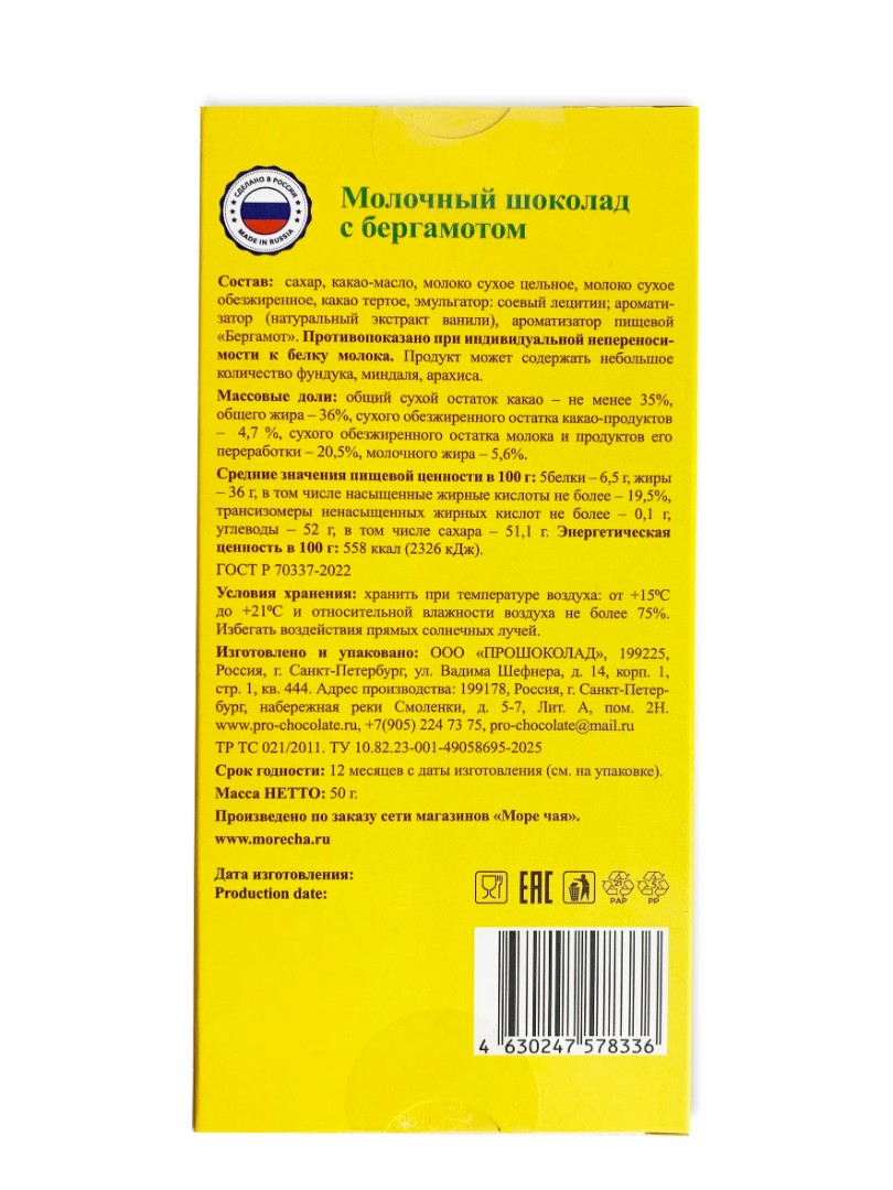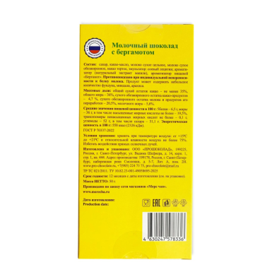 - Состав: сахар, какао-масло, молоко сухое цельное, молоко сухое обезжиренное, какао тёртое, эмульгатор: соевый лецитин, натуральный экстракт ванили, ароматизатор пищевой "Бергамот".