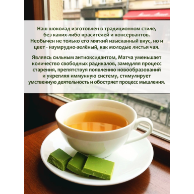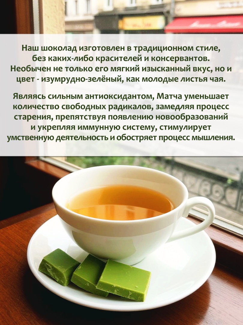 - Состав: шоколад белый (сахар, какао-масло, молоко сухое цельное, молоко сухое обезжиренное, эмульгатор соевый лецитин), премиальный чай матча.