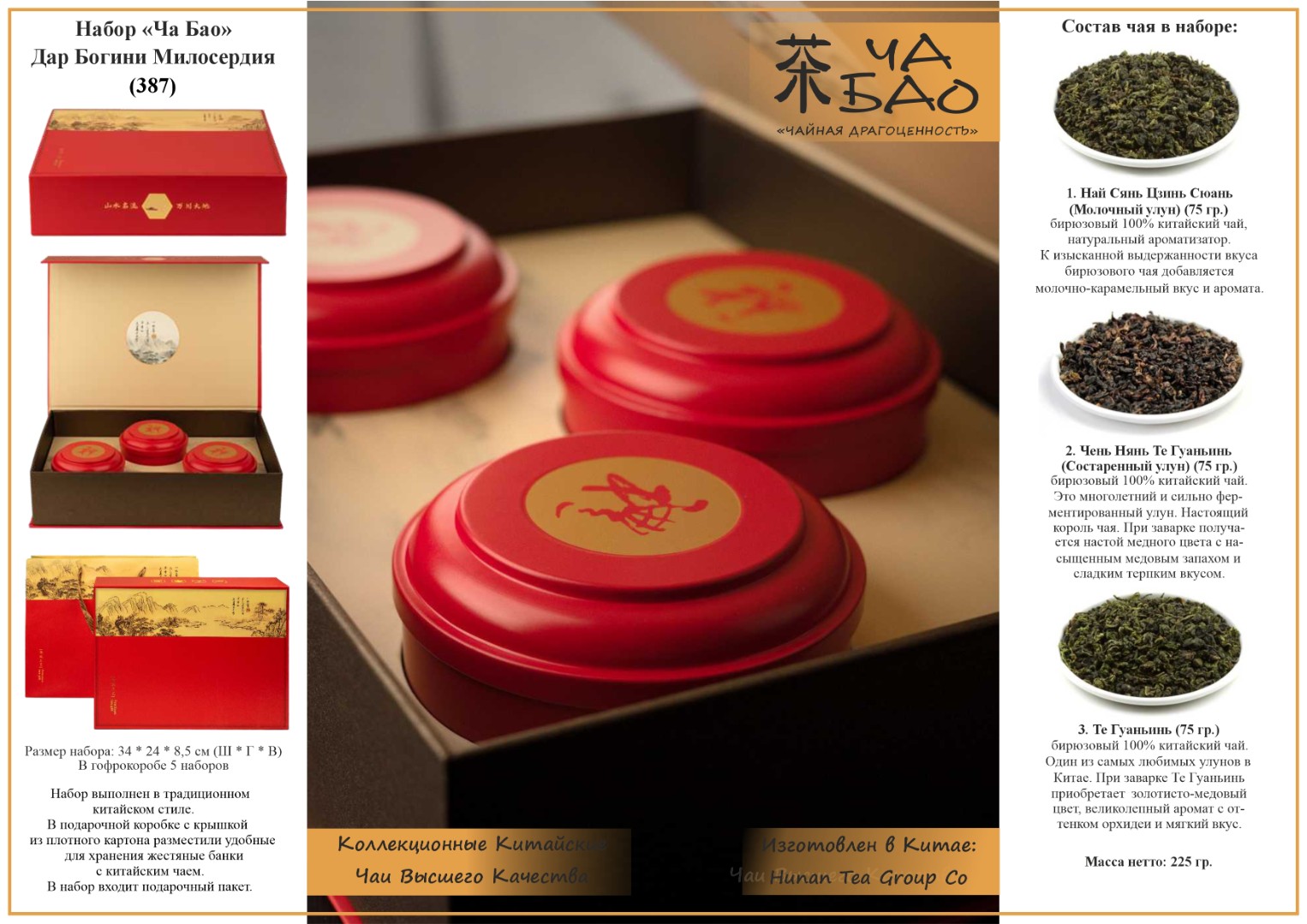 - Состав: 1. Те Гуаньинь (75 гр.) бирюзовый байховый 100% китайский чай. 2. Чень Нянь Те Гуаньинь (Состаренный улун) (75 гр.) бирюзовый байховый 100% китайский чай. 3. Най Сянь Цзинь Сюань (Молочный улун) (75 гр.) бирюзовый байховый 100% китайский чай.