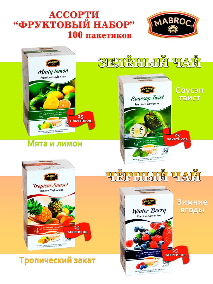 Встречайте фруктовую новинку от Mabroc — идеальный набор для любителей чая! Этот 100% цейлонский зелёный и чёрный чай с привычными и экзотическими добавками.