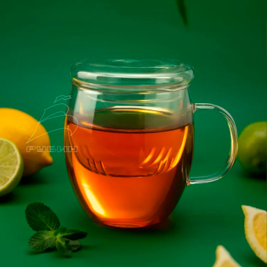 Кружка изготовлена из жаропрочного боросиликатного стекла, что обеспечивает устойчивость к высоким температурам и механическим повреждениям. Это гарантирует долгий срок службы и сохранение первоначального вида даже при ежедневном использовании.