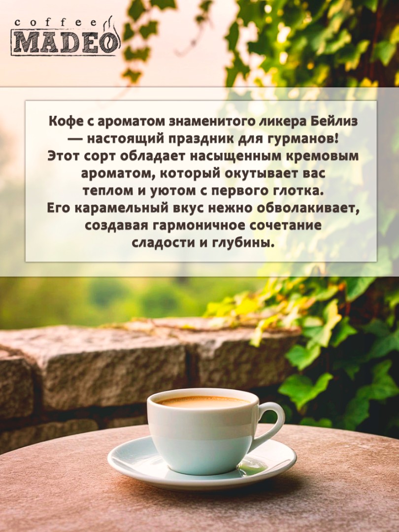 Представьте себе момент, когда вы берёте в руки свою любимую кружку, и вас встречает восхитительный аромат, напоминающий о самых приятных моментах жизни. Это не просто кофе — это искусство, воплощённое в каждой чашке. Встречайте кофе "Мадео" с ароматом Бейлиз — напиток, который создан для тех, кто ценит роскошь, утончённость и незабываемые вкусовые ощущения.