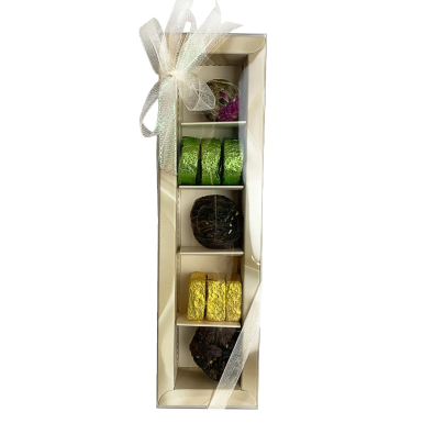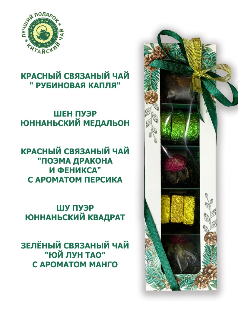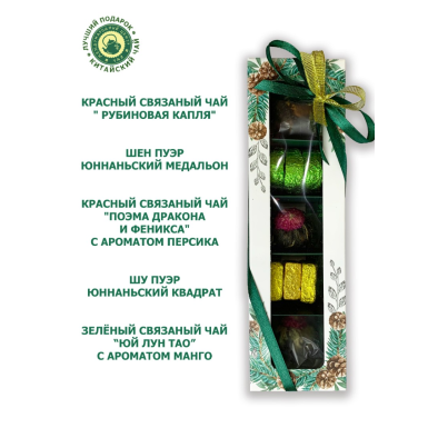 - Состав: 1 - Шу пуэр Юннаньский квадрат 2 - Шен пуэр Юннаньский медальон 3 - Красный связаный чай "Поэма дракона и феникса", с ароматом персика 4 - Зелёный связаный чай " Юй Лун Тао", с ароматом манго 5 - Красный связаный чай "Рубиновая капля"
