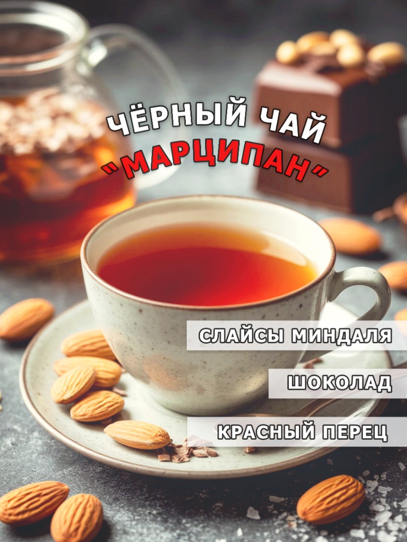 - Состав: черный листовой чай, слайсы миндаля , кусочки шоколада, красный перец, ароматизатор натуральный
